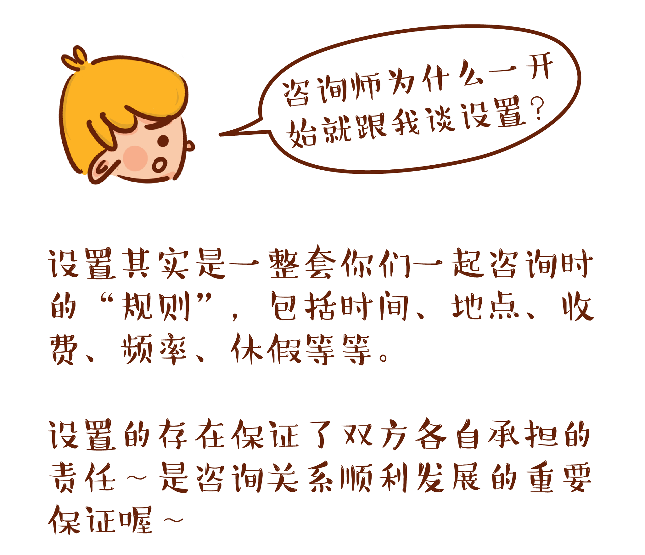 在咨询进程中,当有“设置”之外的情况发生(如咨询师请假、费用变更、你未按时到场、你希望更改设置等),除了在现实层面的讨论以外,你和咨询师会有机会在内心层面讨论和探索这些事情本身带给你的感受、幻想和愿望。