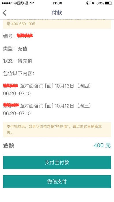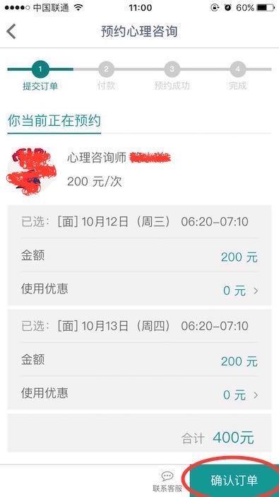 3.当选好时间后,就需要提交订单啦!由于我上一步选择了两个咨询时段,所以价格是400元哦!
