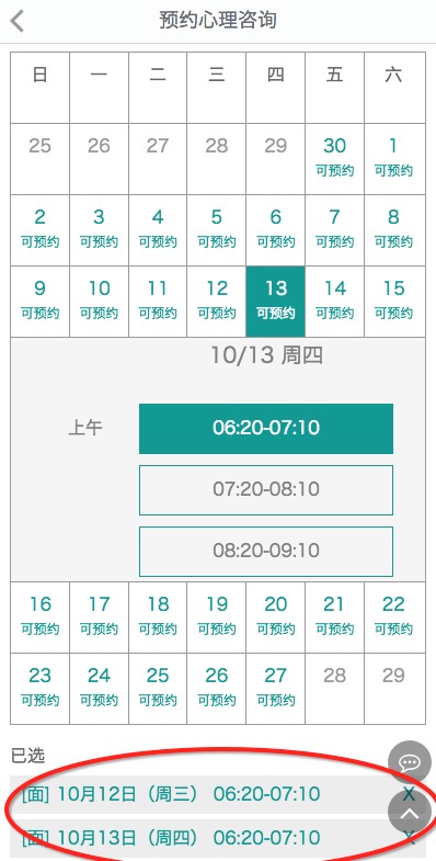 2.下一步选择咨询时间,系统会根据你上次咨询的日期默认选择一周后的相同时段作为你下次咨询的时间,你也可以选择和咨询师商议好的某个时间,或一次性选择多个时段。如下图中,我们就选择了10月12和13日两天的某个时段作为接下来咨询的时段了