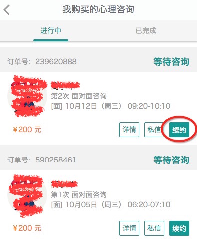 1.当你完成一次咨询后,可以在 我的-心理咨询 中找到对应的记录并续约