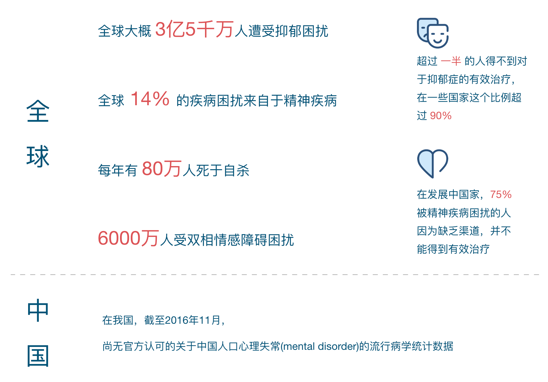 工作、生活、感情等方面影响着现代人的身心健康,除了严重的精神疾病之外,更多人们经受着“失眠”、“抑郁”、“焦虑”、“无意义”等问题。人们需要获得更多专业信息及服务来帮助自己。